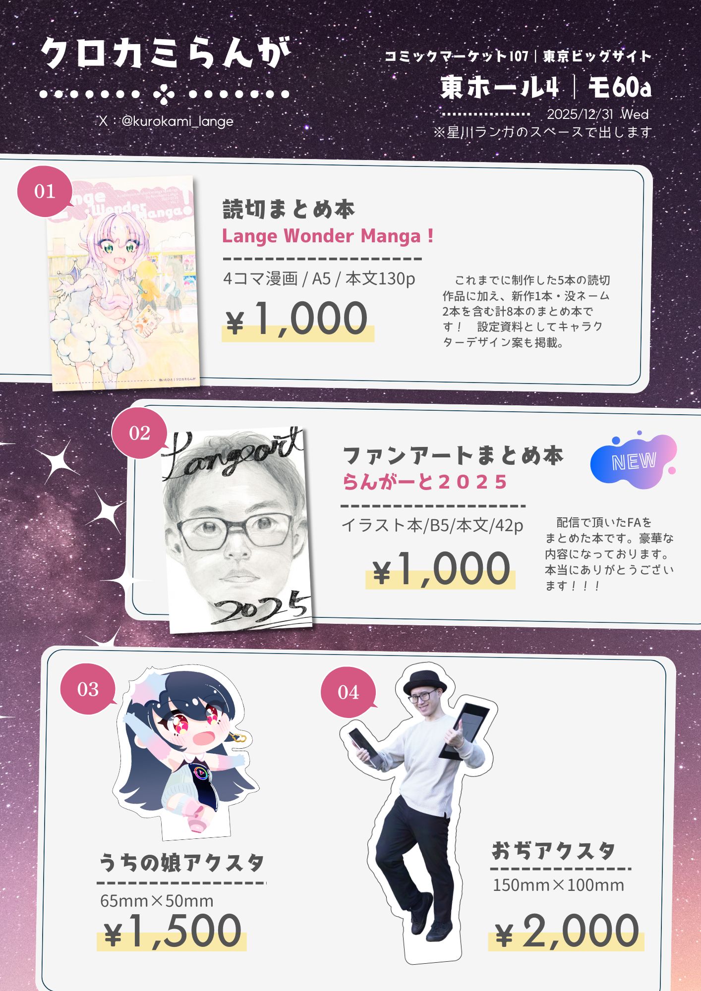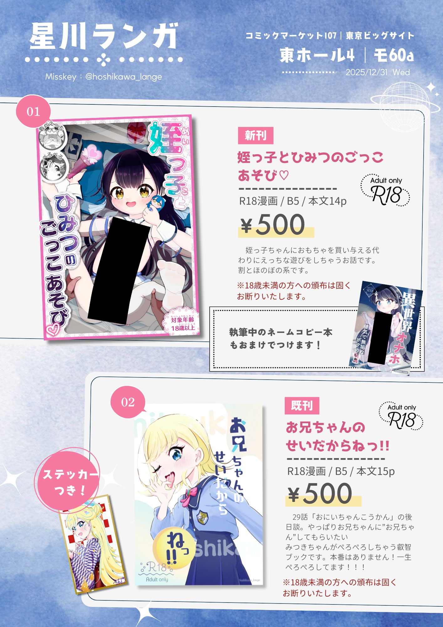 途中離席する時は売り子さん(ミギさん)が居ると思います。状況は成人向け側はMisskey(@hoshikawa_lange)、一般向けにはX(@kurokami_lange)でポストするので、お越しくださる際の参考にしてもらえれば!
